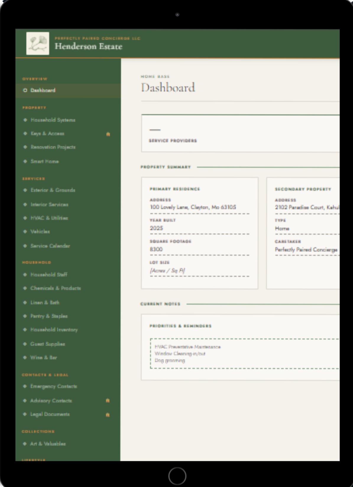 Built for executive households and complex environments, it captures the full operational profile of a residence: systems, service providers, staff, schedules, sensitive contacts, and the details that only get noticed when something goes wrong.